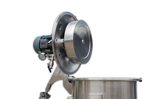 centrifugal disc, the product is then sprinkled in radial direction toward the chamber wall. It then stops there, flows by gravity, and forms another layer all over the wall below the centrifugal disc, and finally arrives at the discharge port, and discharged by means of a positive displacement pump (screw pump, diaphragm pump or the other type).
