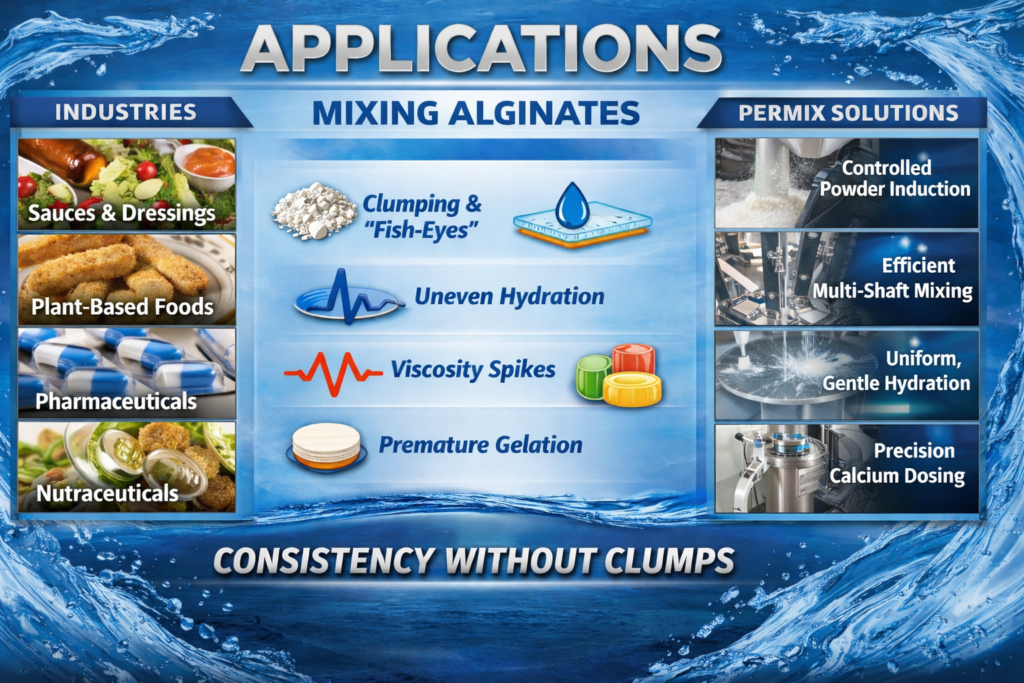 First, controlled powder induction. PerMix mixers can be configured with low-shear powder wet-out zones or vacuum-assisted powder induction. This lets alginate particles enter the liquid phase individually, not as a floating powder raft destined to clump.