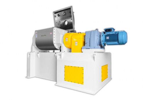 El tornillo de extrusión-descarga está situado en la sección de la silla de montar y se desplaza en un canal cilíndrico tangencial a las 2 palas mezcladoras y por debajo de ellas. Durante el ciclo de mezclado, el tornillo mueve el material dentro del alcance de las palas mezcladoras, asegurando así una mezcla completa de todos los ingredientes y, al mismo tiempo, acelerando el proceso de mezclado. En el momento de la descarga, el sentido de giro del tornillo se invierte y el material mezclado se extruye a través de unas aberturas adecuadas en el lateral de la máquina. El tornillo de extrusión tiene su propio accionamiento separado, de modo que las cuchillas y el tornillo funcionan de forma independiente.