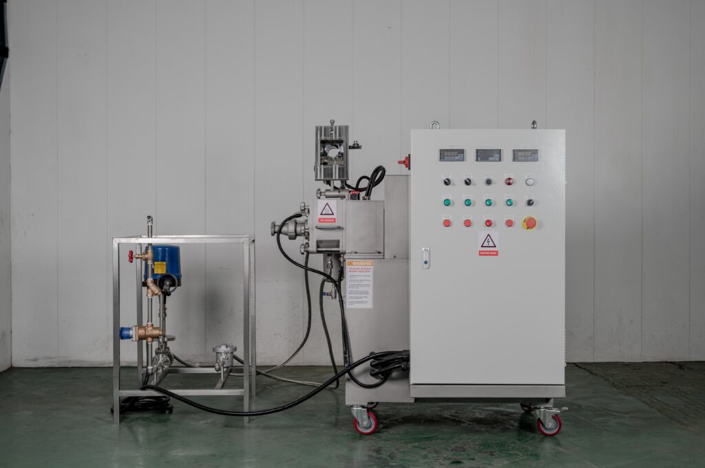 Here is our 1 liter Vacuum Sigma Mixer & Extruder that was designed with vacuum, as well as a jacket that allows for product temperature control. In addition to this, we also have a steam proportioning valve that is used for injecting steam into the product as it is mixed. This allows for quick heating and melting and assists with the mixing.